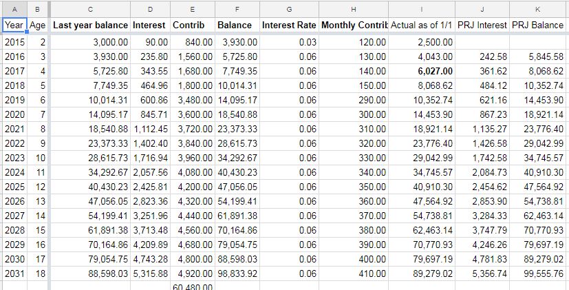 The plan is simple, 100 dollars a month, increasing that amount by 10 dollars every birthday. One catch to the plan in that there a 130 dollar a month jump on their 5/6th birthday. That is the celebration of them not being in daycare anymore, it represents less than 10% of the monthly cost.... (side note, there is a plan for at least some of that money as well... while post-daycare the kids costs will seem light as feather, it is better to save and bank that money (50%) to cover things like camp, after-school, etc). I also programmed in conservative returns for the duration.