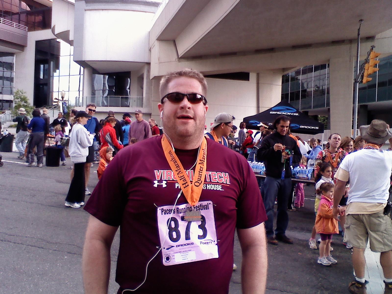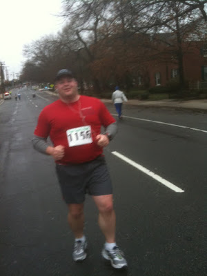 I wore my Vibram Five Fingers for the race. There were about 20 people also wearing them (apparently our secret club acknowledgement is to say "nice shoes" to someone else wearing them. I learned this by the repeated call of that from the people who passed me). My feet are somewhat beat up even on Monday but in more of a just overstretched/tight perspective.